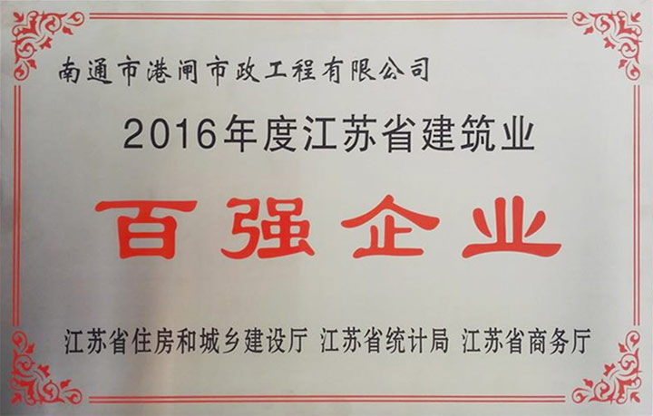 自2014年起,我公司連續(xù)三屆被江蘇省住建廳、商務(wù)廳、統(tǒng)計(jì)局認(rèn)定為“江蘇省建筑業(yè)百?gòu)?qiáng)企業(yè)”(基礎(chǔ)設(shè)施類)。