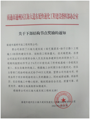 5月24日晚九點,隨著江海大道東延一標圩亭河橋右幅3#橋臺澆筑結(jié)束,標志著我公司承建的江海大道東延一標下部結(jié)構(gòu)(樁基礎(chǔ)含樁底壓漿、承臺及墩身)的施工在全線七個標段中率先完成,比合同約定完成的節(jié)點時間提前了22天。受到工程建設(shè)指揮部的表彰和節(jié)點獎勵。